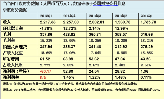 我們?cè)倏匆幌鹿镜臉I(yè)績(jī)表現(xiàn),以下表格是當(dāng)當(dāng)網(wǎng)的相關(guān)歷史財(cái)務(wù)數(shù)據(jù),從中可發(fā)現(xiàn)幾個(gè)比較顯著的特征: -這是一家業(yè)務(wù)比較穩(wěn)健的公司,各項(xiàng)比率在不同會(huì)計(jì)期間都比較不亂; -公司的業(yè)務(wù)也呈現(xiàn)穩(wěn)步增長(zhǎng)的態(tài)勢(shì); -2014年是第一年泛起全年盈利年份,主要仍是得益于規(guī)模的增長(zhǎng); -2015年第一季度重大虧損,主要由于電子書(shū)、移動(dòng)和內(nèi)容業(yè)務(wù)的投入導(dǎo)致毛利下滑; 假如從資產(chǎn)負(fù)債角度看,截止2015年3月31日確當(dāng)當(dāng)網(wǎng)總資產(chǎn)約46億元人民幣,凈資產(chǎn)約6億元人民幣,現(xiàn)金及等價(jià)物(含短期投資)余額約為16.4億元人民幣,資產(chǎn)負(fù)債率接近87%,但資產(chǎn)的質(zhì)量仍是不錯(cuò)的, 以活動(dòng)資產(chǎn)為主。但因?yàn)閮糍Y產(chǎn)總量偏低(近6億多人民幣),假如采取激進(jìn)經(jīng)營(yíng)戰(zhàn)略又無(wú)法盈利的情況下,可能會(huì)導(dǎo)致凈資產(chǎn)為負(fù)數(shù),因此穩(wěn)健的經(jīng)營(yíng)戰(zhàn)略是個(gè)現(xiàn)實(shí)的選擇。但可能正由于如斯,假如不考慮并購(gòu)的整合效應(yīng),當(dāng)當(dāng)網(wǎng)的估值也會(huì)受一定程度的到負(fù)面影響。 從現(xiàn)金流角度看,2014年和2013年連續(xù)兩年的經(jīng)營(yíng)流動(dòng)現(xiàn)金流都是正數(shù),分別為2.65億和2.73億元人民幣。 所以從歷史數(shù)據(jù)來(lái)看,可以預(yù)計(jì)2015年當(dāng)當(dāng)網(wǎng)的收入規(guī)模會(huì)突破100億元人民幣的規(guī)模,基于公司歷史的穩(wěn)健經(jīng)營(yíng)風(fēng)格和治理層在最新季度業(yè)績(jī)公告上所宣稱的對(duì)將來(lái)業(yè)績(jī)頗為樂(lè)觀,其業(yè)績(jī)猜測(cè)和估值水平到底應(yīng)該是多少才是公道和公允?