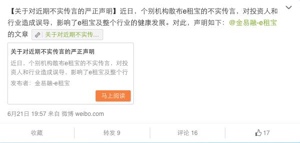 圖片來自無界新聞 昨天晚上開始,e租寶官網(wǎng)、APP均無法正常打開,一度引發(fā)了投資人的恐慌。e租寶官方微博稱是為了“防止不實傳言引發(fā)恐慌和無序贖回、提現(xiàn),本著保護客戶資金安全、平臺交易安全的原則,e租寶平臺主動向社會各界公布暫停平臺交易。” 為解答投資人普遍擔心的資金安全題目,e租寶的客戶經(jīng)理向他們?nèi)喊l(fā)短信表示“團體在調(diào)查期間,主動封鎖凍結(jié)了中信銀行風險保證金11億和足以籠蓋剛性兌付的應兌付客戶本金和收益”。 但是!今天中信銀行出來打臉了!據(jù)網(wǎng)易財經(jīng)報道,中信銀行稱“e租寶在中信銀行并無風險備用金賬戶,僅開立活期賬戶余額0元!” 知道真相的投資者們眼淚有沒有掉下來?