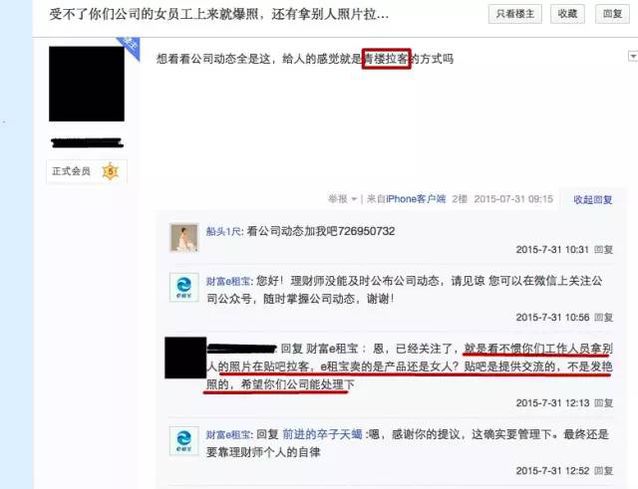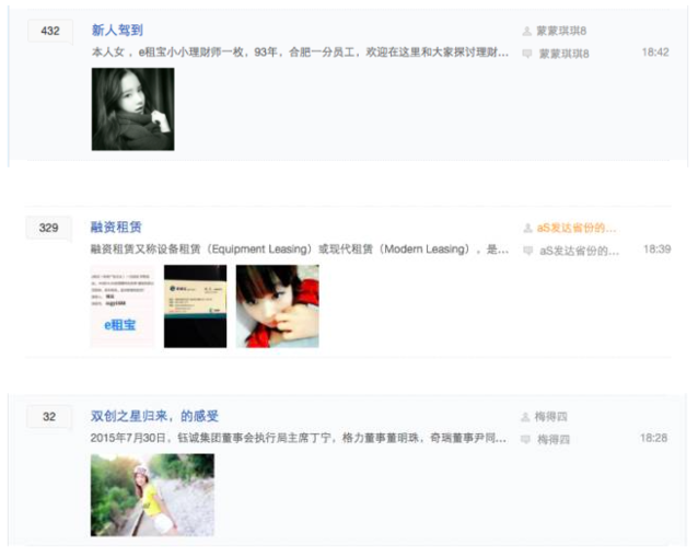 另外,鈺誠團體成立的人武部也被該員工稱為是鈺誠彈壓上門討要工資員工的黑社會組織,鈺誠的董事長丁寧要下屬稱其為“丁主席”,稱總經(jīng)理魏引忠為“政委”。搜索百度百科,人武部即人民武裝部是我國在縣(旗,縣級市、市轄區(qū))、鄉(xiāng)(鎮(zhèn))和大中型廠礦、大專院校設立的軍事工作部分,企業(yè)中固然也有設立人武部的但都是國有大中型企業(yè),像鈺誠團體這樣的中外合資公司是否有資格成立人武部,相信良多人心中都會存有迷惑,但是當時人武部成立揭牌典禮的時候,當?shù)剀姺謪^(qū)領導、市區(qū)政府領導、人武部相關領導及全國多家媒體均有出席,還有良多報道稱之積極支持國防建設。 小插曲 打開e租寶的百度貼吧就可以看到一種與公司高大上不相符的氣質(zhì),良多都是所謂的新入人員工爆照。