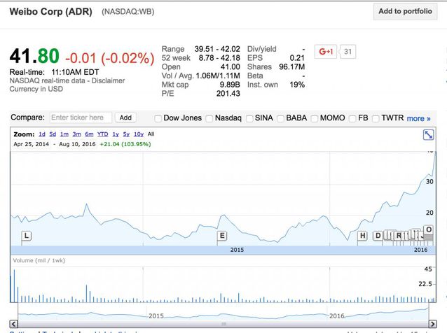 微博發(fā)布2016年二季度財報,業(yè)績相稱亮眼,利潤同比大漲5倍有余。 在中國互聯(lián)網(wǎng)這二十多年的發(fā)展歷史上,微博算是一個另類。它的獨特點在于,很少有像它這樣被輿論一致看好然后又一致看衰卻又在看衰中崛起的產(chǎn)品。 2011年,微博在輿論看多中走到頂峰,一度有所謂“微博改變中國”的說法。 2012年,微博開始走上下坡路,一個很有趣的現(xiàn)象就是,從“天天都要刷微博”到“現(xiàn)在還有什么人在用微博?” 2014年,微博上市,海內(nèi)輿論依然不是太過看好,一個很重要的原因在于,微信及其公家賬號平臺吸引了太多的目光。 2016年,微博強勢崛起,到8月份為止,股價已經(jīng)連拉六個月的陽線。當(dāng)下股價創(chuàng)下歷史新高,突破40美元。 一 股價的上漲,背后是業(yè)績。打2014年上市之后,微博的業(yè)績的確讓人滿足。