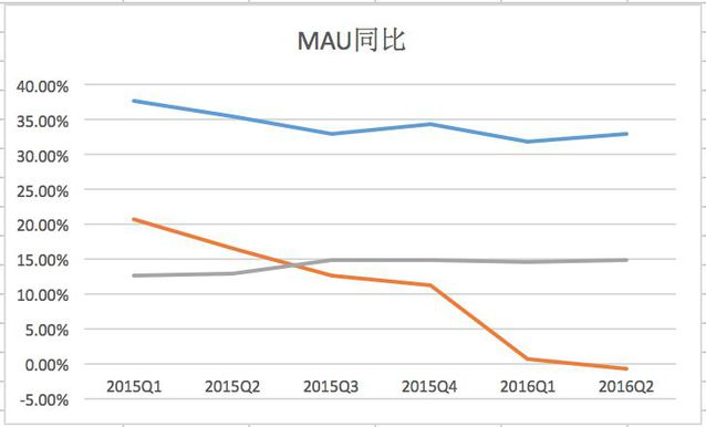 主要體現(xiàn)在銷售、治理及行政用度這一項中。Twitter這一塊開支連續(xù)兩年都占據(jù)了營收的一半,而微博則較為克制。 這可能是影響利潤的因素之一。說白了,Twitter的職員開支占比比較大。 但這好像很難去解釋為什么Twitter的活躍用戶量一直得不到快速的增長。 把Facebook的MAU季同比增長數(shù)據(jù)加入后,可以得到如下這張圖: