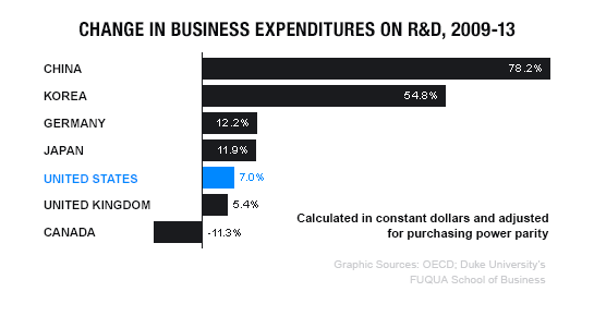 根據(jù)杜克大學(xué)商學(xué)院的研究,在2009-2013年之間,各國貿(mào)易投入在R&D (Research & Development)研發(fā)的比重來看,中國的研發(fā)比例儼然超過美國一大截。