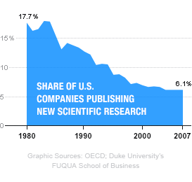 假如將歷史周期再拉的長一點(diǎn),從1980年到2007年,美國在研發(fā)上的本錢比重,降低的速度已然讓人驚奇。尤其是參考在新科學(xué)研究領(lǐng)域的專業(yè)文章數(shù)目來看,已然從17.7%下降到了6.1%。杜克大學(xué)的研究教授Ashish Arora表示,從資本市場的反饋來說,越是注重研發(fā)的企業(yè)的市值,反而不如在研發(fā)上投入較小的企業(yè)的市值評估。他說,相對于35年之前,現(xiàn)在的企業(yè)對于基礎(chǔ)科學(xué)的看重減少了,而需求就更少了。
