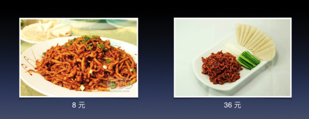 所以假如有來生,我但愿我不再做演講,這是我最大的心愿。 良多人不知道,他們認(rèn)為我喜歡演講。不說來生,就單說這一生,假如不用再做演講,我愿意少活 5 年。但是之前媒體所傳的「假如讓我不用再做演講,我愿意讓出一半股份」這個話是我沒有說過的。 今天我們來一個沒有什么主題的演講,隨便和大家聊一聊。 為什么中國人如斯在意性價比?「為什么要在性價比漫山遍野的時代打造一個精品手機(jī)品牌?」這是我常常被投資人問到的題目。良多人以為這是一個分歧時宜的做法,但是我自己不這樣理解。 我們討論下一個題目,「為什么中國人如斯在意性價比?」 大家以為這是什么原因?我們出去跟日本、美國的運(yùn)營商溝通時,他們常常會聊到這個題目,說中國人是如斯的在意性價比。當(dāng)時我聽了挺氣憤的,心想:你們這些富六代、富七代真是沒有窮過。假如他們窮過,是可以理解的。我是 1972 年出生,小時候沒遇上餓肚子,但是我遇上了多年的營養(yǎng)不良(固然現(xiàn)在看起來不太像),所以我實(shí)在非常理解這個東西。 我年青的時候中國的京醬肉絲通常長成這個樣子,這些年中國人固然買手機(jī)時候很在意性價比,但是整體上日子好過了。這些年我們看到的京醬肉絲通常長這個樣子,精致良多、味道好了良多、擺盤很講究,看得出是專心做過的。