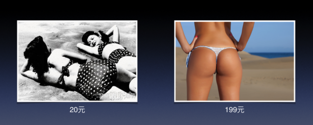 價格有什么變化?我年青時候左邊一大盤差未幾有一斤肉,在東北的菜館一定有一斤肉,差未幾要 8 塊錢,F(xiàn)在呢?36 塊錢。我想拿這個說明一下消費(fèi)觀念的變化跟發(fā)展水平是息息相關(guān)的。 再看一下這個例子,我年青的時候假如去海灘上看看,婦女們穿的泳裝基本是這樣子,包住臀部的樣子比腦袋還要大。這些年我們?nèi)ズ┛吹降挠狙b已經(jīng)是這個樣子。價格發(fā)生了什么變化?左邊那么多布料用了 20 塊錢,右邊基本沒用布料,我們甚至懷疑那是不是布料,它還要 199 塊錢。所以良多時候就是這樣非常簡樸的道理,外國人不知道,由于那些發(fā)達(dá)國家沒有經(jīng)歷過這樣的時代,但是我們很清晰。