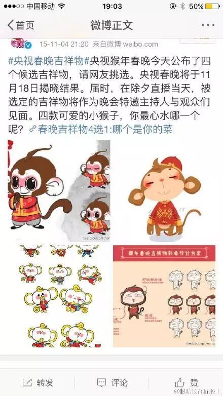 也難怪在央視發(fā)布吉利物的半個(gè)小時(shí)內(nèi),評(píng)論就已經(jīng)由萬(wàn),微博話題#猴年春晚吉利物#三個(gè)小時(shí)閱讀量就達(dá)811萬(wàn),討論5.3萬(wàn),登上微博排行榜第一名。