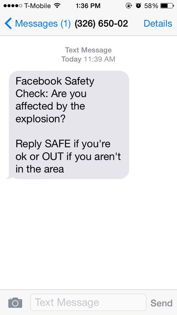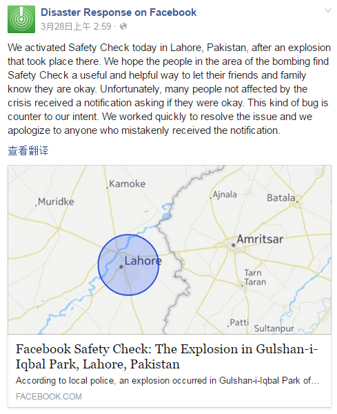 (圖片來源:推特) 可是當(dāng)戴爾先生慌忙望向窗外,卻只見天空晴朗,街道上行人自若,哪有半點(diǎn)失事了的痕跡?類似的短信也發(fā)到了印度等國(guó)家Facebook用戶的手機(jī)上,用戶之間廣泛傳播,一時(shí)間人心惶惶。 事實(shí)上,這是在當(dāng)天巴基斯坦發(fā)生爆炸事件后,F(xiàn)acebook啟用平安信使功能,將通知發(fā)送給受到波及的地區(qū)用戶,讓他們?cè)贔acebook上向親朋摯友報(bào)個(gè)平安。但由于程序錯(cuò)誤,這則信息被發(fā)送到了遠(yuǎn)在美國(guó)、歐洲、東亞的用戶,不明真相的用戶接到提醒后,造成了小規(guī)模的恐慌。 烏龍事件在推特等社交網(wǎng)絡(luò)上引發(fā)燒議,有用戶批評(píng)Facebook是在添亂。Facebook官方也在晚些時(shí)候發(fā)出報(bào)歉。