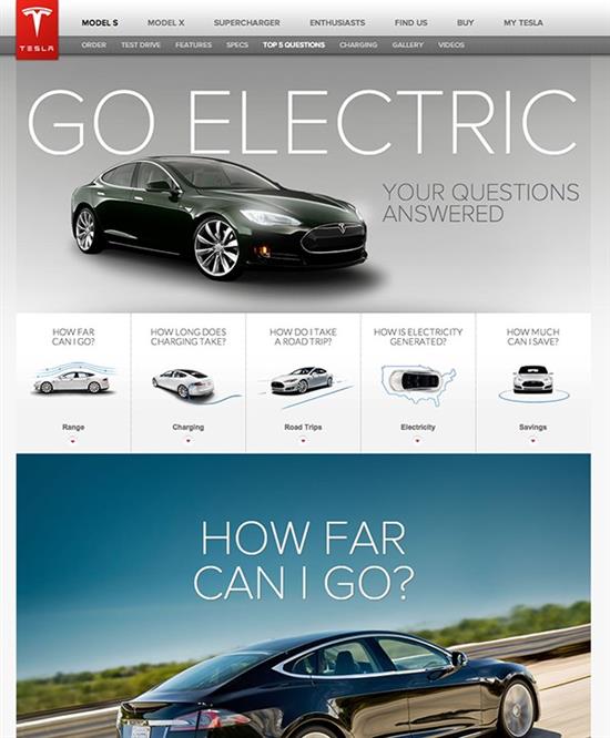 9. 交互式故事 你想把所有的內(nèi)容聚在一起嗎?假如你的品牌由一系列概念或價(jià)值(優(yōu)雅、創(chuàng)造力,簡約等),從頁面布局到字體選擇,你都能通過頁面元素和交互性故事來闡述品牌和理念。如特斯拉的官網(wǎng)。