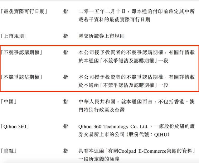 360和酷派正在經(jīng)歷著一場明爭冷戰(zhàn),跟著上周360祭出要求酷派以14.85億美元認沽奇酷公司期權(quán)這個殺招后,兩家的關(guān)系徹底撕破,也開始了互相扯皮的口水戰(zhàn)。這邊酷派稱360沒有履行合約內(nèi)容,360則發(fā)布聲明稱酷派違背了競爭協(xié)議,一時間到底誰說謊了呢?包括價值兄在內(nèi)的各位,想必都想直到背后的真相到底是什么吧。價值兄這里拿到了當時360與酷派合作時候簽署的協(xié)議的全部內(nèi)容,獨家還原兩家當初還甜美如初戀的公司,為什么會走向不共戴天的地步。 焦點一:14.85億美元認沽權(quán)到底該不該得到支持 上周360發(fā)布聲明稱,酷派違背同業(yè)競爭協(xié)議,360決定行使相關(guān)認沽期權(quán),將其所持有的全部股權(quán)按市場價的兩倍出售給酷派公司,即要求酷派以兩倍的價格回購360所持有的49.5%的奇酷科技股權(quán)(價值7.425億美元),總金額為14.85億美元。面臨市值僅6.68億美元(截至2015年9月11日收盤,酷派市值51.80億港幣)的酷派,可謂難于登天。 那么到底360和酷派簽署的協(xié)議是怎么劃定的呢?價值兄這里獨家拿到了協(xié)議的全文,第一時間提供應(yīng)各位查閱(如下圖)。 圖1-2是酷派和360簽署的的股東,可以看出來,酷派團體與360在2015年2月12日簽署了這份協(xié)議,已經(jīng)在圖4的香港有關(guān)部分公然表露,完全具備法律效力。