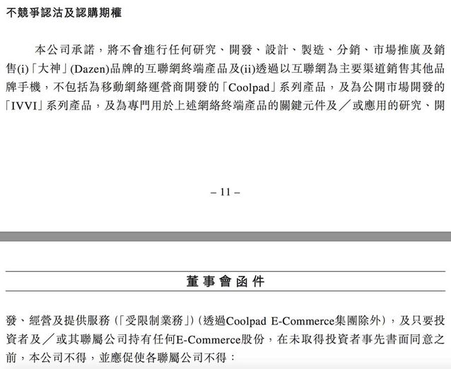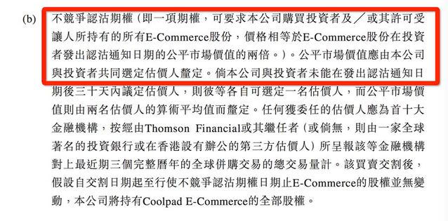 圖4 那么360和酷派的“認沽權(quán)”是怎么劃定的呢?可以看出,假如雙方劃定了兩種方式“不競爭認購期權(quán)”和“不競爭認沽期權(quán)”(圖5),并且分別劃定了相應(yīng)的權(quán)利和義務(wù)(圖6-圖8),尤其是圖7,非常具體的劃定了假如違背“不競爭認沽期權(quán)”的內(nèi)容,即酷派不得直接或間接于中國或美國“在與受限制業(yè)務(wù)相同或相似或與之競爭的任何業(yè)務(wù)中擁有任何權(quán)益、治理、控制、介入、咨詢、提供服務(wù)或以其他方式從事,或從事協(xié)助”,而眾所周知的是,2015年6月28日,酷派發(fā)布的《控股股東出售股份公告》顯示,郭德英家族通過信托計劃持股的Data Dreamland以3.508港元每股的對價向樂視聯(lián)系關(guān)系公司出售7.8038億股,占已發(fā)行總股本的18%,后者曾經(jīng)推出了多款手機產(chǎn)品,與360、酷派合資的奇酷科技的業(yè)務(wù)線重疊嚴峻,顯然,酷派這是演了一出“一女嫁二夫”的小算盤,但是卻健忘了當初與360簽署的協(xié)議,以及必需履行的義務(wù)。