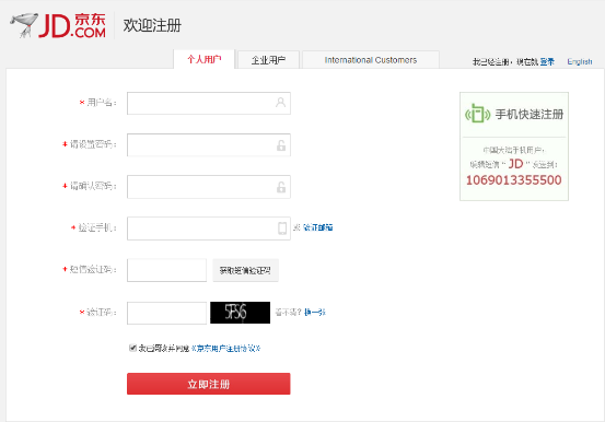 京東分為個(gè)人、企業(yè)、國(guó)際三類用戶,用戶注冊(cè)需要填寫的選項(xiàng)良多,較為繁瑣。