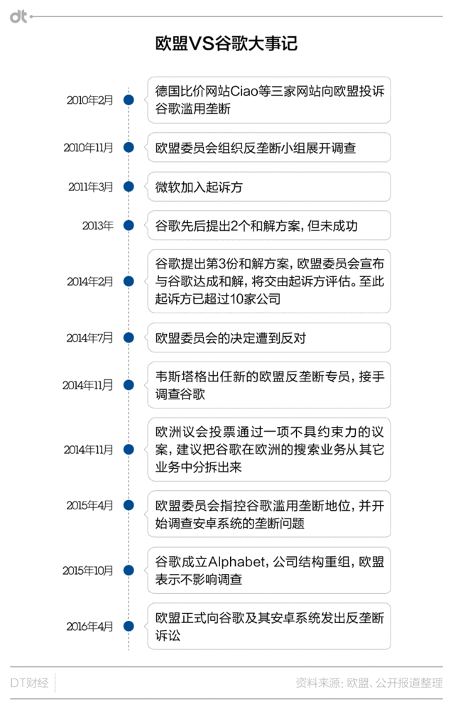 谷歌的反壟斷案,可能即將以30億罰款來(lái)終結(jié) 據(jù)英國(guó)《逐日電訊報(bào)》報(bào)道,歐盟委員會(huì)近期將公布對(duì)谷歌涉嫌壟斷的罰款數(shù)額,而這一數(shù)字可能高達(dá)破紀(jì)錄的30億歐元。而到目前為止已有的最高反壟斷罰單,是2009年對(duì)芯片制造商英特爾公司11億歐元罰款。 讓谷歌雪上加霜的是,這30億歐元恐怕還不是上限,根據(jù)相關(guān)法律,歐盟委員會(huì)最高可以對(duì)公司處以其年?duì)I業(yè)額10%的罰款。也就是說(shuō),谷歌公司面對(duì)的罰款上限將達(dá)60億歐元。 事情大概是這樣的:2010年下半年,幾家搜索及比價(jià)網(wǎng)站指控谷歌利用其搜索上風(fēng)推廣自家服務(wù),損害競(jìng)爭(zhēng)對(duì)手利益。之后歐盟對(duì)谷歌的反壟斷調(diào)查開(kāi)始,這一被形容為“史詩(shī)級(jí)”的訴訟正式拉開(kāi)序幕。在之后的近6年的調(diào)查中,谷歌曾先后三次提出和解方案,但終極都被拒絕。 DT君為大家總結(jié)了這場(chǎng)訴訟的歷史: