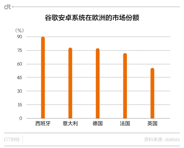 可以看出,歐盟主要針對(duì)的是谷歌預(yù)裝安卓及自己軟件的行為。歐盟以為,谷歌這樣做是在抹殺規(guī)模較小的立異型應(yīng)用制造商和服務(wù)供給商。 實(shí)在,對(duì)于預(yù)裝行為的懲罰,歐盟此前也干過(guò)。2007年了解的微軟壟斷案中,歐盟就是認(rèn)定微軟濫用了其在個(gè)人電腦(PC)操縱系統(tǒng)領(lǐng)域的主導(dǎo)地位,向消費(fèi)者強(qiáng)行推廣其媒體播放器,案件的總罰款超過(guò)20億歐元。 但此次案件與之不同的是,微軟的預(yù)裝可以直接帶來(lái)銷售利潤(rùn)。而安卓則是免費(fèi)的。那歐盟為何還這么擔(dān)心呢?恐怕是由于谷歌安卓在歐洲的“勢(shì)力”其實(shí)太大。 根據(jù)statista的統(tǒng)計(jì),安卓在歐洲各國(guó)的市場(chǎng)份額很高,在西班牙甚至達(dá)到了九成。