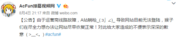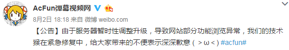 A站2016年8月2日就在官方微博上表示,因為A站服務器暫時性調(diào)整進級,導致網(wǎng)站部門功能瀏覽異常,A站的技術(shù)職員在緊急修復中,給大家?guī)淼牟槐惚硎旧钌钋敢狻?/p>