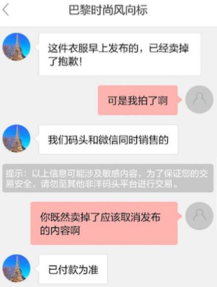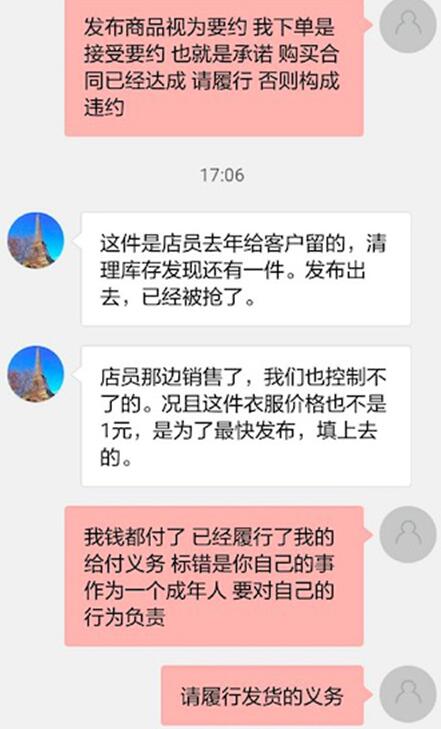 1元搶購(gòu)成功賣(mài)家拒不發(fā)貨 當(dāng)天1元搶購(gòu)成功后,陳同學(xué)很快收到了巴黎時(shí)尚風(fēng)向標(biāo)店鋪發(fā)來(lái)的動(dòng)靜,賣(mài)家表示商品已經(jīng)賣(mài)出無(wú)法給陳同學(xué)發(fā)貨,同時(shí)表示,這件衣服的價(jià)格并不是1元,是為了最快發(fā)布才填上去的。 ![]()