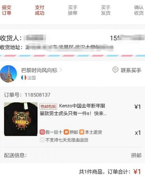 一件kenzo衛(wèi)衣讓武漢的陳同學(xué)(化名)走上了維權(quán)的道路。 11月25日,陳同學(xué)在洋碼頭“巴黎時(shí)尚風(fēng)向標(biāo)”以1元的價(jià)格搶得一件原價(jià)1599元kenzo虎頭衛(wèi)衣。誰(shuí)知付款成功后,賣(mài)家卻并不愿意發(fā)貨。 為了維護(hù)自己的權(quán)益,陳同學(xué)與洋碼頭、巴黎時(shí)尚風(fēng)向標(biāo)展開(kāi)一場(chǎng)有關(guān)消費(fèi)者權(quán)益保護(hù)的斗爭(zhēng)。 ![]()