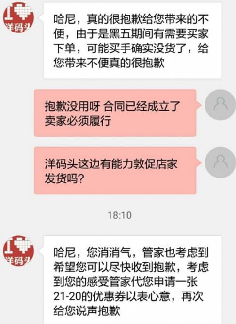 陳同學(xué)以為,買(mǎi)賣(mài)雙方合同已經(jīng)形成,并不是賣(mài)家說(shuō)沒(méi)貨就能取消發(fā)貨的,立即拒絕了洋碼頭客服的優(yōu)惠券并請(qǐng)洋碼頭督促賣(mài)家發(fā)貨。 盡管有洋碼頭平臺(tái)客服參與,但賣(mài)家仍遲遲未發(fā)貨。在與洋碼頭客服進(jìn)行在線溝通以及電話溝通后,12月3日洋碼頭方面向陳同學(xué)報(bào)歉,因?yàn)殛愅瑢W(xué)所搶購(gòu)的Kenzo虎頭衫為限量款,賣(mài)家沒(méi)有存貨,于是將其市場(chǎng)價(jià)格1500元補(bǔ)償給了陳同學(xué)。 1元搶購(gòu)衛(wèi)衣成功賣(mài)家卻不發(fā)貨,最后洋碼頭補(bǔ)償了陳同學(xué)1500元。從11月25日到12月3日,由于一件衛(wèi)衣,陳同學(xué)與賣(mài)家、洋碼頭多方溝通,耗時(shí)8天,拿到1500元補(bǔ)償后的陳同學(xué)隨后將這筆錢(qián)捐給了“但愿工程一對(duì)一助學(xué)”。 賣(mài)家拒不發(fā)貨并不是個(gè)案 維權(quán)期間,陳同學(xué)在自己的個(gè)人微博具體記實(shí)著事件的進(jìn)展。很快他發(fā)現(xiàn),在今年的“玄色禮拜五”購(gòu)物期間,有不少的網(wǎng)友都與他有著相同的遭遇。 據(jù)陳同學(xué)先容,有一位網(wǎng)友表示,自己同樣遭遇了搶購(gòu)成功但賣(mài)家不發(fā)貨的情況。賣(mài)家甚至以“無(wú)貨”為由,要求買(mǎi)家取消訂單。 ![]()