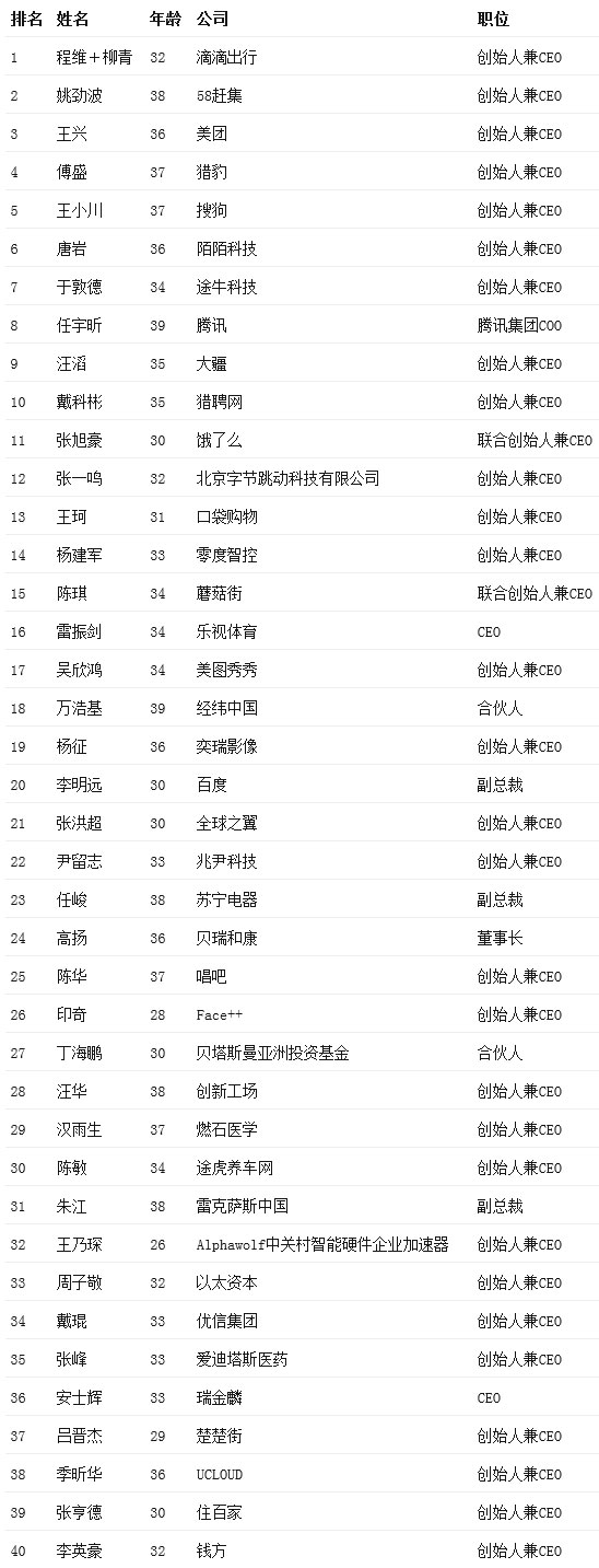 北京時間11月2日晚間動靜,《財富》(中文版)本日正式宣布2015年"中國40位40歲以下的商界精英"榜單。 其中滴滴出行CEO程維、總裁柳青并