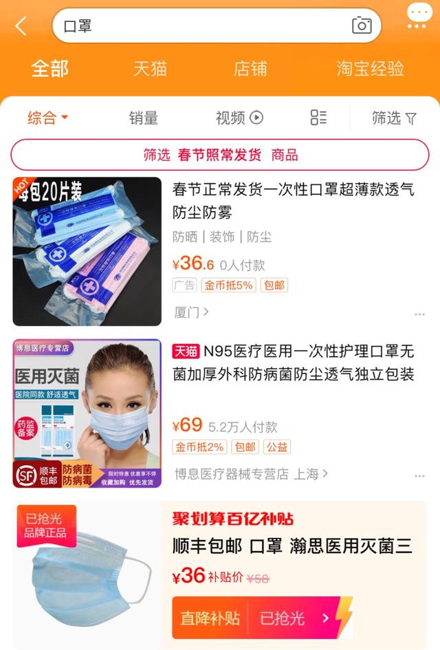 26日,記者查閱主流電商渠道淘寶、天貓、蘇寧易購、京東、拼多多等電商渠道的口罩銷售情況,不少商家打出了“春節(jié)不打烊”的標(biāo)語,但部分緊俏類型口罩類防護(hù)用品仍缺貨,