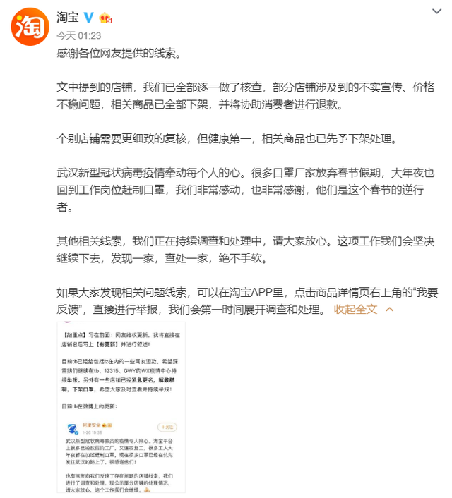 1月27日消息,今天凌晨,淘寶官方微博宣布,針對網(wǎng)友曝光有淘寶店肆口罩呈現(xiàn)不實(shí)宣傳、價格不穩(wěn)等問題,淘寶官方已對相關(guān)店肆悉數(shù)逐個核查,部分店肆涉及到的不實(shí)宣傳、