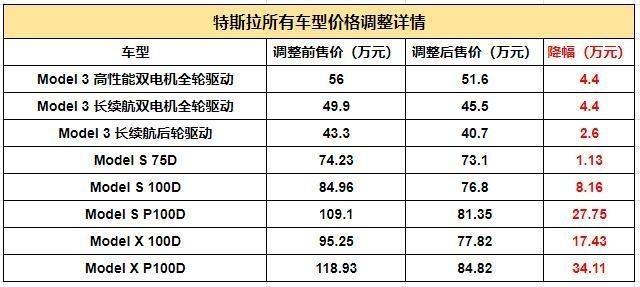 特斯拉全系車型再次呈現(xiàn)大幅調(diào)價,其最高降幅車型為Model X P100D車型,降幅達到了34.11萬。其中Model 3降價區(qū)間為2.6-4.4萬、Model S降價為1.13-27.75萬、Model X降價區(qū)間為17.45-34.11萬。
