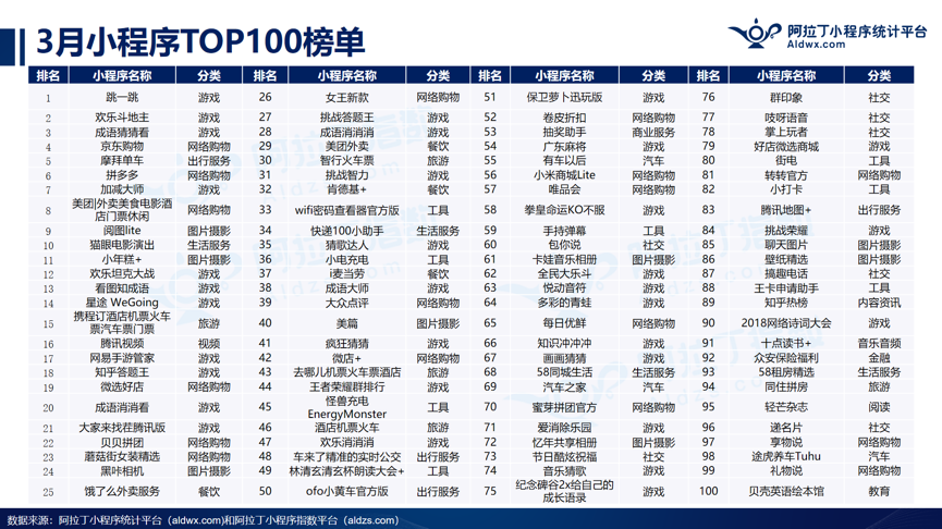 2018年4月18日,阿拉丁小程序核算途徑和阿拉丁指數(shù)一同發(fā)布了2018年3月TOP100小程序榜單。阿拉丁核算途徑和阿拉丁指數(shù)在榜單的實時性、算法、樣本數(shù)量、多職業(yè)維度(添加了小程序游戲、外交、轎車、圖片拍照等)四個方面進行了全面晉級。