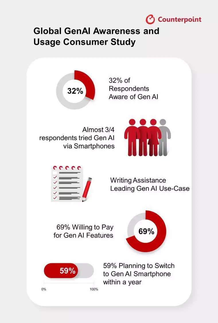 根據(jù) Counterpoint Research 的報告,生成式 AI 手機普及浪潮將至,以下是具體介紹: 消費者認知與意愿