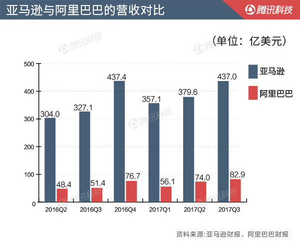 亞馬遜、阿里巴巴相繼發(fā)布2017年第三季度財(cái)報(bào)。亞馬遜本年體現(xiàn)亮眼,但阿里巴巴體現(xiàn)更好。阿里巴巴趕超亞馬遜的腳步更近了。市值方面,阿里巴巴也曾在10月10日盤(pán)中一度超過(guò)亞馬遜。