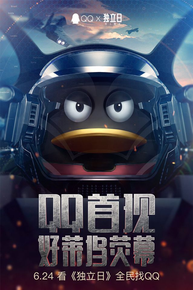 6月24日,時(shí)隔20年重啟的好萊塢科幻災(zāi)害巨片《獨(dú)立日·卷土重來》登陸中國大陸院線。影片男女主角進(jìn)行地月通話,結(jié)束時(shí)電腦屏幕顯示QQ企鵝