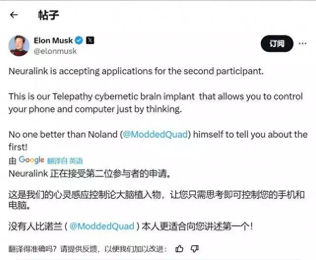 馬斯克宣布,繼年初首個(gè)參與腦機(jī)設(shè)備植入實(shí)驗(yàn)的患者手術(shù)成功100天后,Neuralink(神經(jīng)連接公司)正式開(kāi)始招募第二個(gè)接受腦機(jī)植入的患者。腦機(jī)接口技術(shù)是一種在腦與外部設(shè)備之間建立直接的通信渠道的技術(shù)。