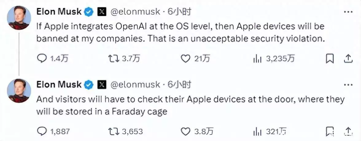 在批判OpenAI這件事上,馬斯克總是沖在第一線(xiàn),孜孜矻矻營(yíng)業(yè),不遺余力地揭示OpenAI在迷失本心、AGI安全治理、信息泄露等方面的諸多問(wèn)題。馬斯克與蘋(píng)果之間的糾葛似乎由來(lái)已久。