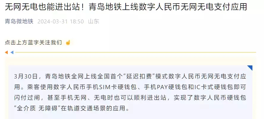 青島地鐵在2024年3月30日全網(wǎng)上線了全國首個“延遲扣費(fèi)”模式的數(shù)字人民幣無網(wǎng)無電支付應(yīng)用,這一創(chuàng)新舉措使得乘客即使在手機(jī)無網(wǎng)、無電的情況下,也能順利進(jìn)出站。