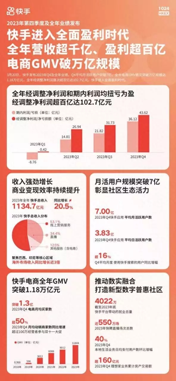 快手電商在2023年實現(xiàn)了全年GMV達到1.18萬億元的壯舉,這一數(shù)字背后是大眾市場增量的有力支撐。每月有1.3億用戶在快手上進行購物,這龐大的用戶基數(shù)為快手電商的穩(wěn)健增長提供了堅實的基礎(chǔ)。