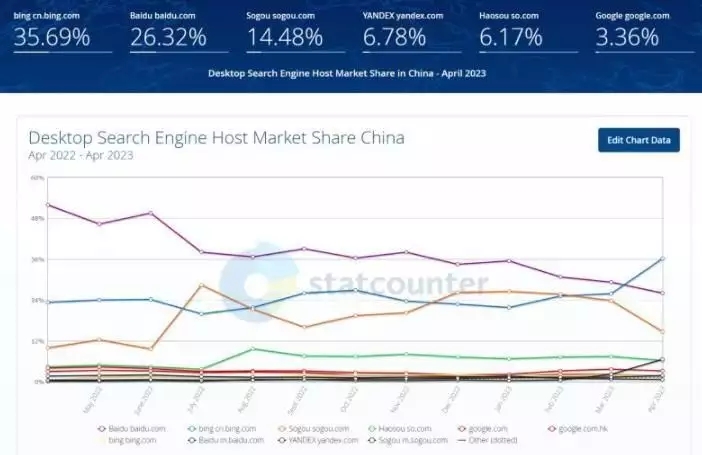 2023年5月22日音訊,據(jù)StatCounter的數(shù)據(jù)顯示,在中國內(nèi)地桌面查找市場上,到2023年4月,微軟必應(yīng)的份額再次創(chuàng)出歷史新高,達(dá)到了37.4%,