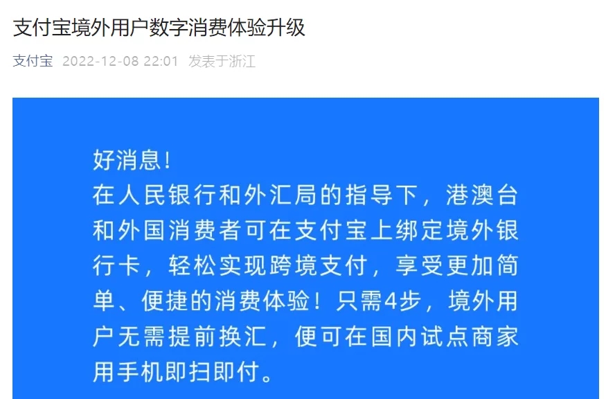 12 月 8 日消息,支付寶今天宣布,在人民銀行和外匯局的指導(dǎo)下,港澳臺(tái)和外國消費(fèi)者可在支付寶上綁定境外銀行卡,輕松完成跨境付出。