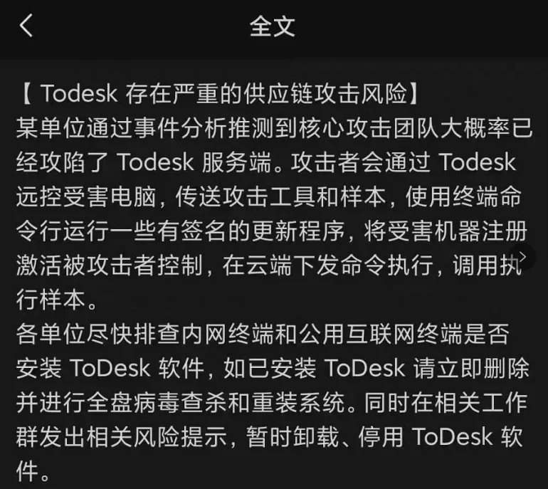 就在前幾天,大名鼎鼎的長(zhǎng)途操控軟件To Desk被爆存在安全縫隙,更有知情人士To Desk總服務(wù)器已被拿下,進(jìn)犯者會(huì)經(jīng)過(guò)To Desk遠(yuǎn)控受害者電腦傳送進(jìn)犯樣本,