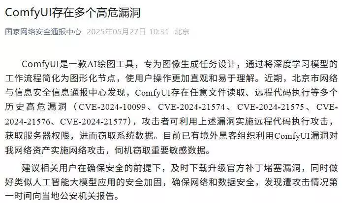 5 月 27 日消息,國家網(wǎng)絡(luò)安全通報(bào)中心今日發(fā)文,稱 AI 繪圖工具 ComfyUI 存在多個(gè)高危漏洞。體現(xiàn)了國家對(duì)網(wǎng)絡(luò)安全風(fēng)險(xiǎn)的高度重視。ComfyUI作為一款基于節(jié)點(diǎn)式工作流的開源Stable Diffusion工具,