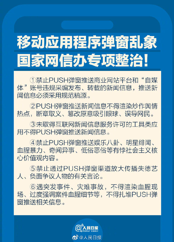 今起,國家網(wǎng)信辦將發(fā)動(dòng)“清朗·移動(dòng)使用程序PUSH彈窗突出問題專項(xiàng)整治”,清晰六項(xiàng)整改要求:①禁止推送商業(yè)網(wǎng)站途徑和“自媒體”賬號(hào)違規(guī)采編發(fā)布、轉(zhuǎn)載的新聞信息;