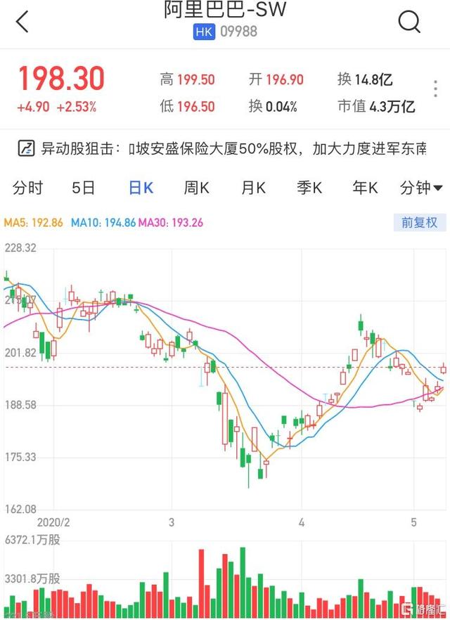 阿里巴巴現(xiàn)報198.3港元,漲2.53%,暫成交14.8億港元,最新總市值4.3萬億港元。 阿里巴巴集團日前宣布,