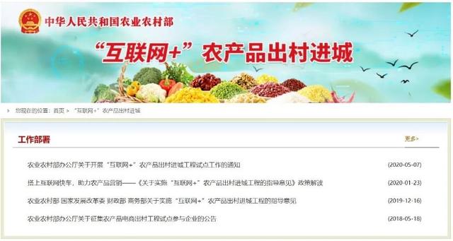 5月7日,農(nóng)業(yè)鄉(xiāng)村部下發(fā)《關(guān)于開展“互聯(lián)網(wǎng)+”農(nóng)產(chǎn)品出村進城工程試點工作的通知》,計劃在2年內(nèi)建成100個示范縣,完成農(nóng)產(chǎn)品出村進城便捷、順利、高效。