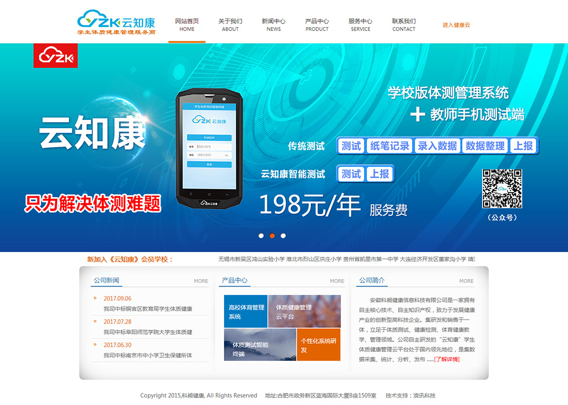 安徽科昶健康信息科技有限公司是一家擁有自主核心技術(shù)、自主知識產(chǎn)權(quán),致力于發(fā)展健康產(chǎn)業(yè)的創(chuàng)新型高科技企業(yè)。集研發(fā)和銷售于一體,立足于體質(zhì)測試、健康檢測、體育健康教學(xué)、管理領(lǐng)域。公司自主研發(fā)的“云知康”學(xué)生體質(zhì)健康管理系統(tǒng)采用先進的云平臺技術(shù),是集數(shù)據(jù)采集、統(tǒng)計、分析、發(fā)布、健康指導(dǎo)的學(xué)生體質(zhì)健康綜合管理云平臺。